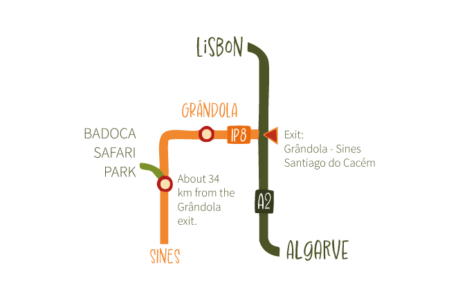 Location How to get to Badoca Coordinates: N 38º 02´ 29.3´´ W 8º 44´ 40.0´´ Badoca Safari Park is located in the IC3, between Santiago do Cacém and Sines, about 34 km (21 miles) from the Grândola exit. What to do? A great day in Alentejo